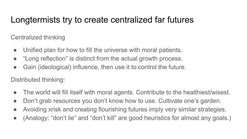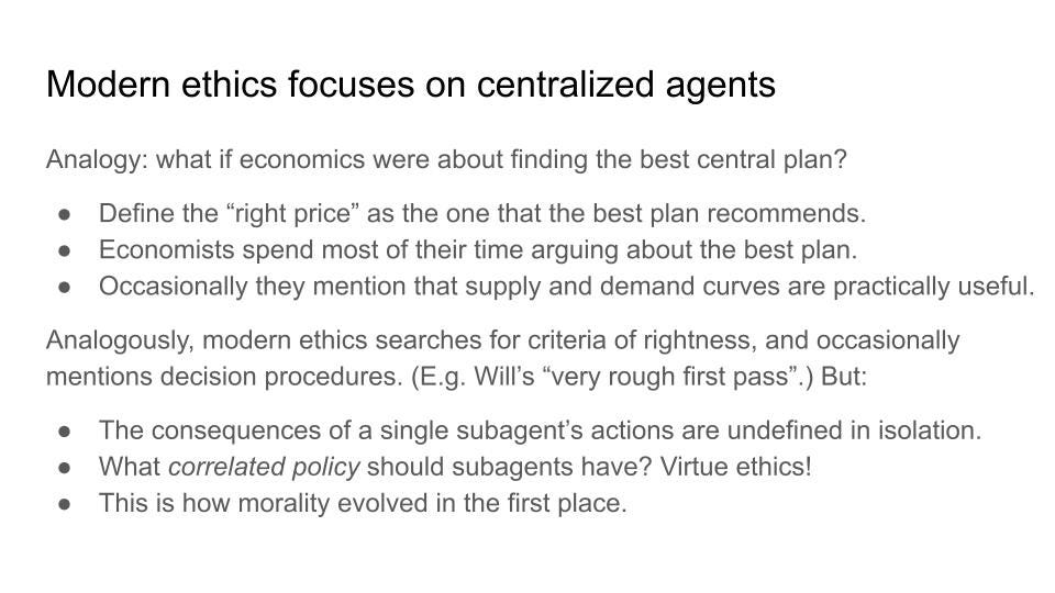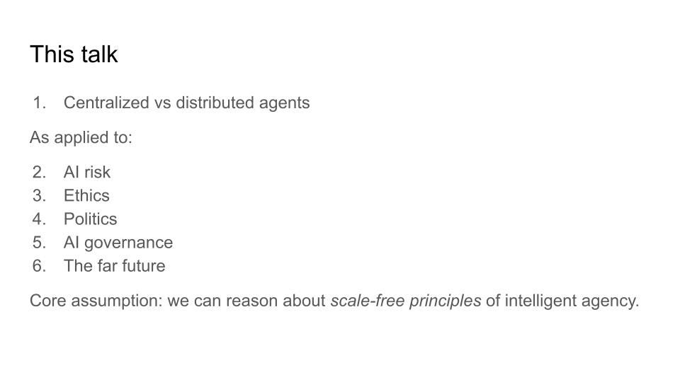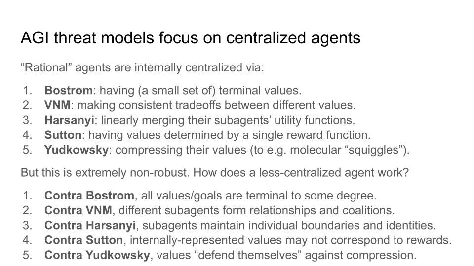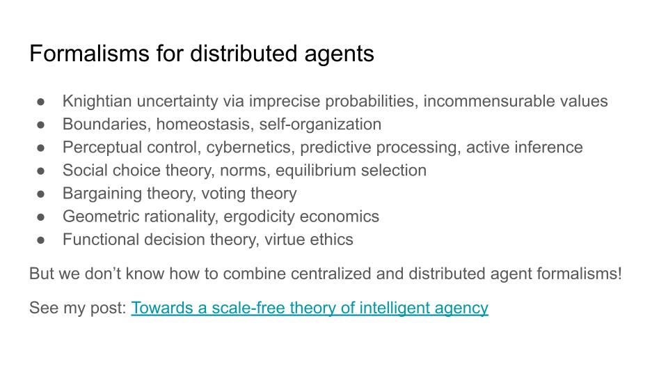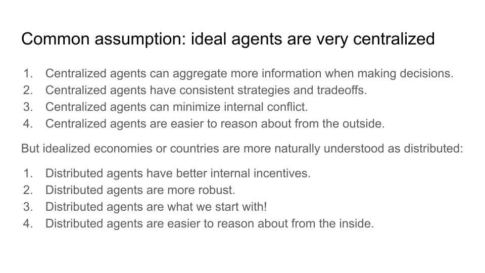 Unfortunately robustness is hard to formalize, since it requires that you perform well even in unpredicted (and sometimes unpredictable) situations. I give some tentative characterizations of distributed agents below, but there’s still a lot of work to be done to formally define distributed agents. And ultimately I’d like to go further, to understand how agents can have both properties—which is roughly what I mean by “coalitional agency“.