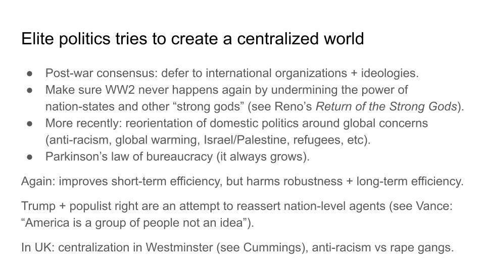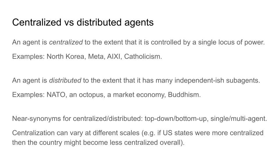 Much of my thinking over the last year has focusing on understanding the concept of “distributed agents”, as opposed to the “centralized agents” that the existing paradigm of expected utility maximization describes. One way of describing the difference is in terms of how autonomous their subagents are. Another is that centralized agents are more efficient (as sometimes formalized by the notion of “coherence”), while distributed agents are more robust.
